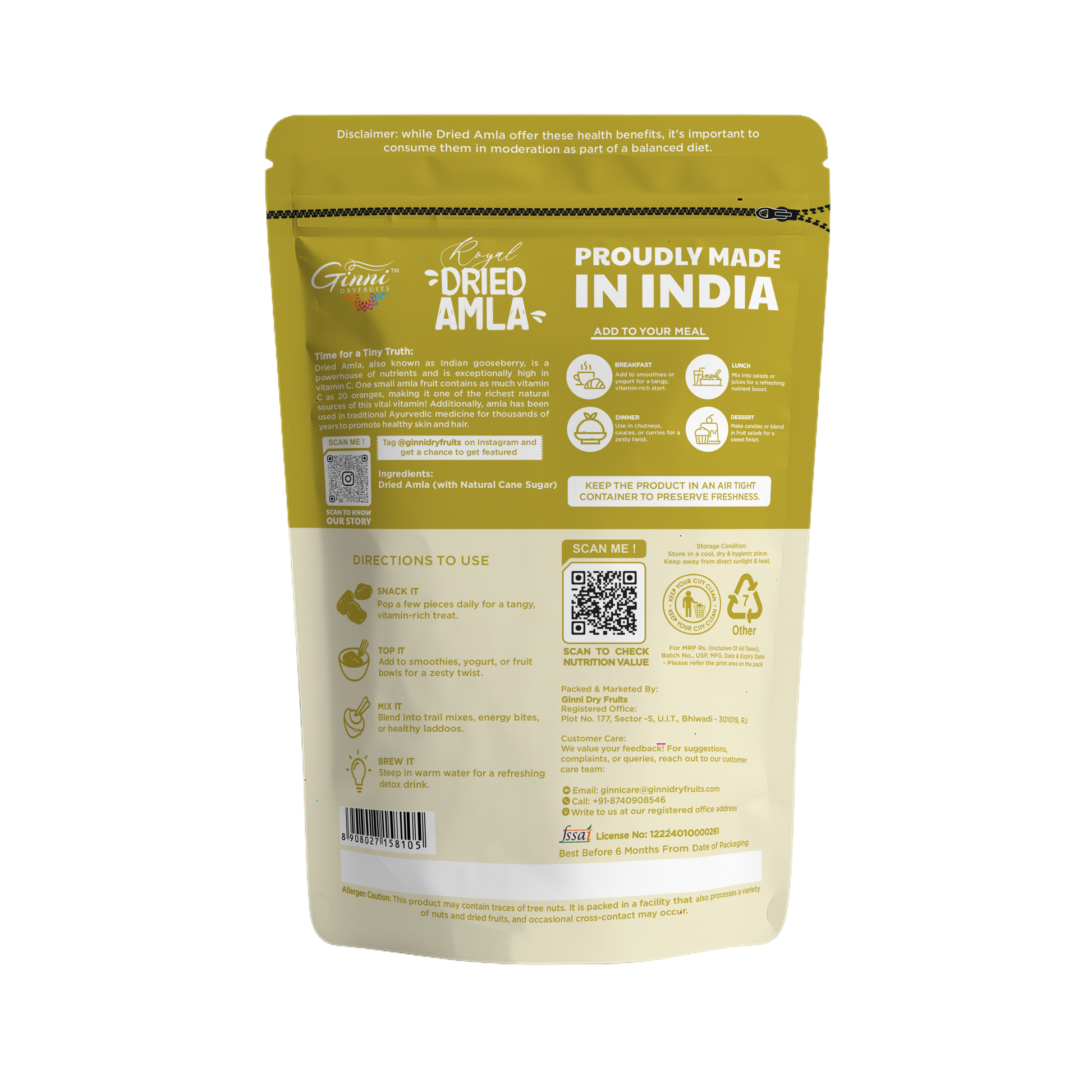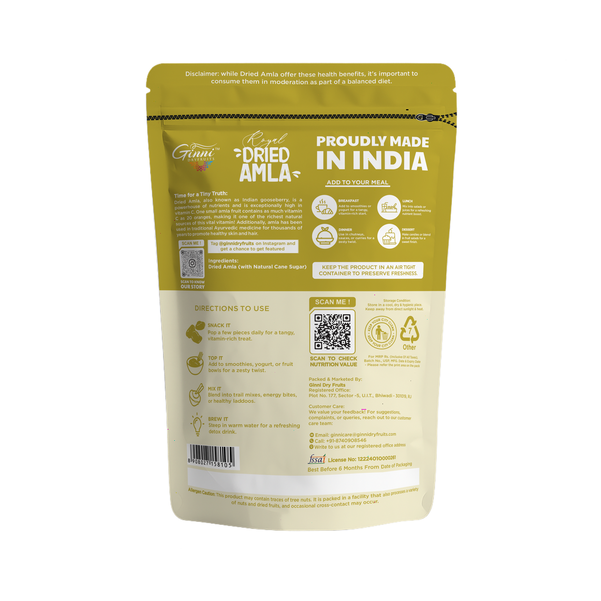 Experience the tangy, vitamin-rich flavor of our premium Dried Amla, carefully selected to retain its natural taste and nutrients. Perfect for snacking, adding to smoothies, cereals, or desserts, it offers a wholesome boost to your daily diet.