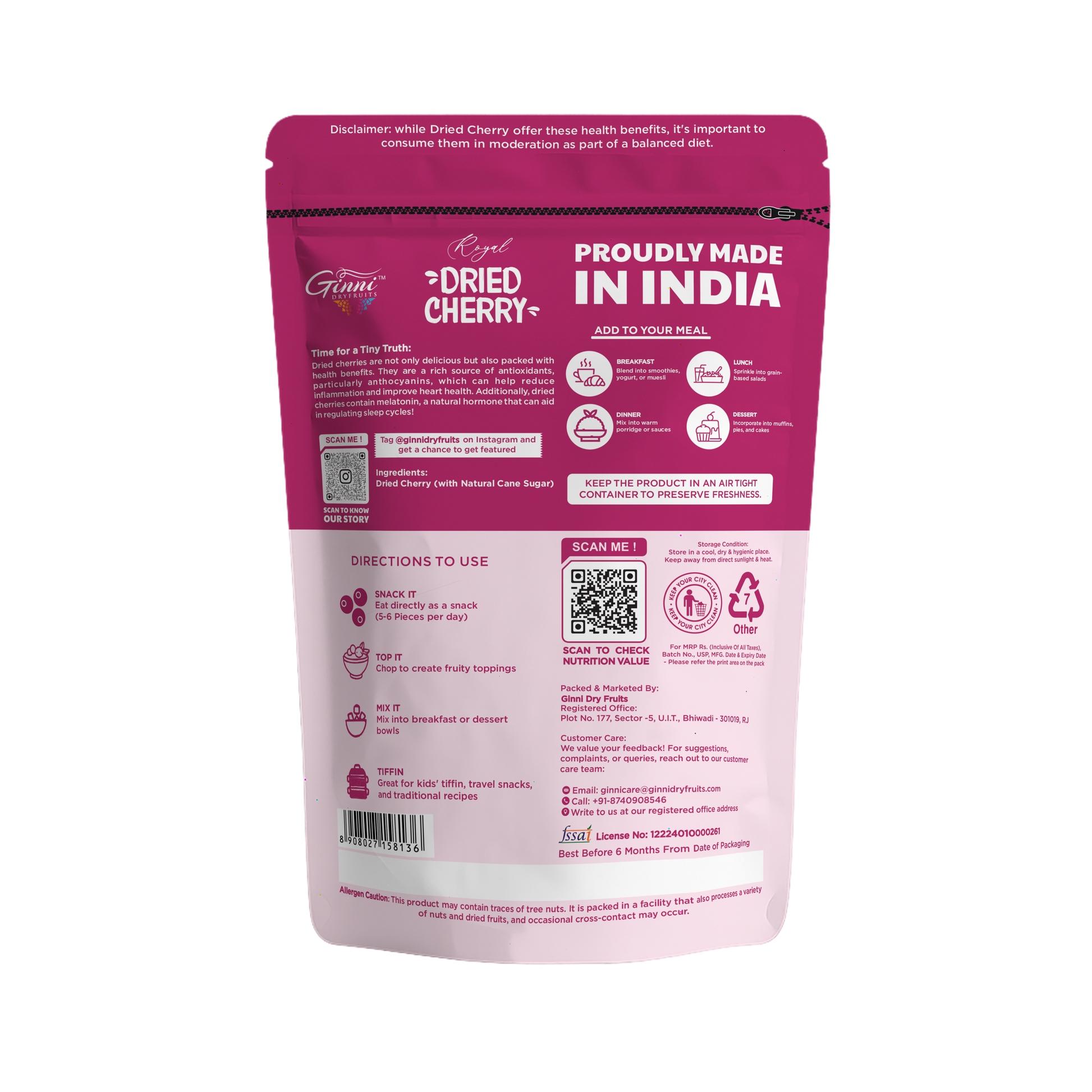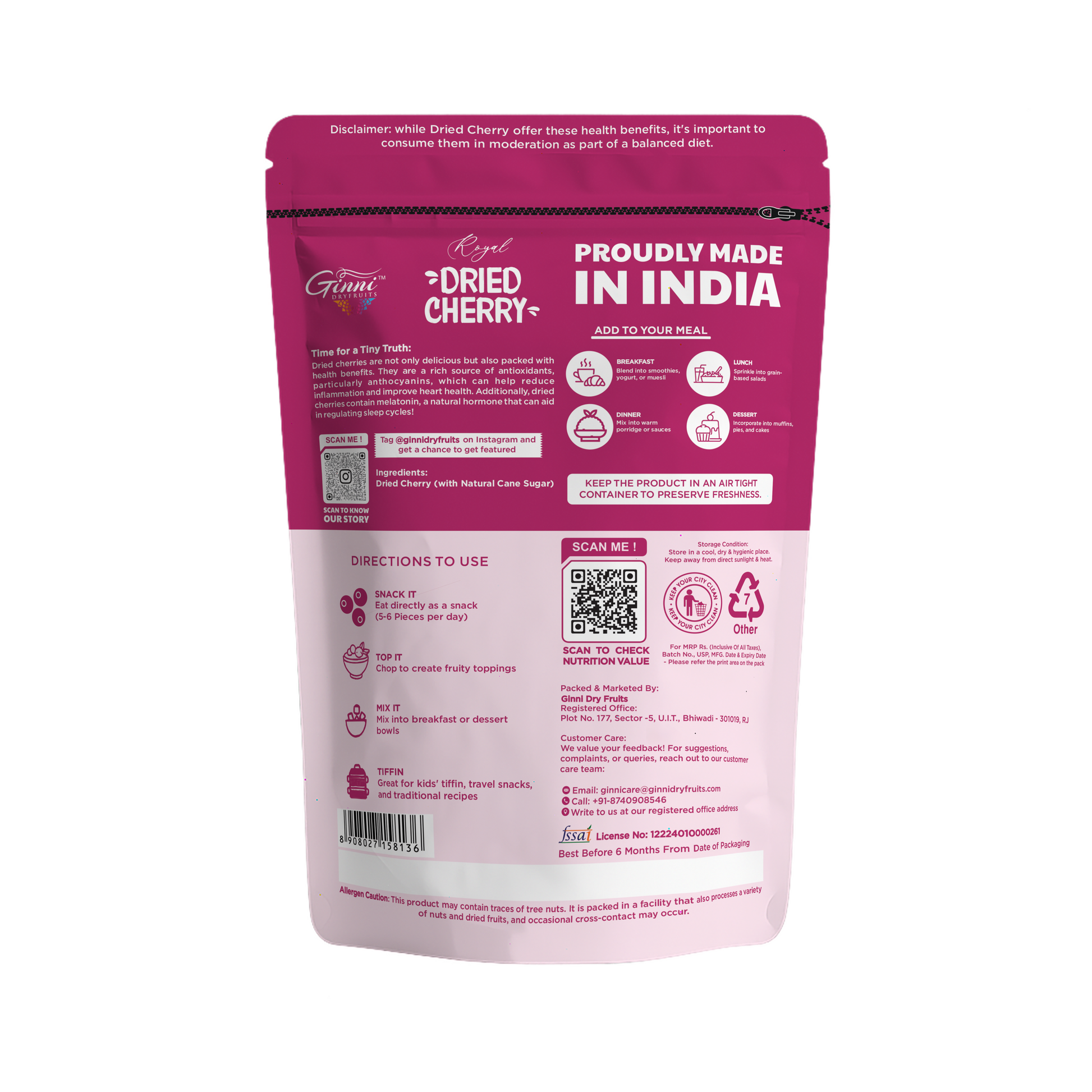 Savor the rich, tart-sweet flavor of our premium Dried Cherries, carefully selected and dried to preserve their natural taste and nutrients. Perfect for snacking, baking, or adding to cereals, smoothies, and desserts, they offer a delightful combination of taste and nutrition.